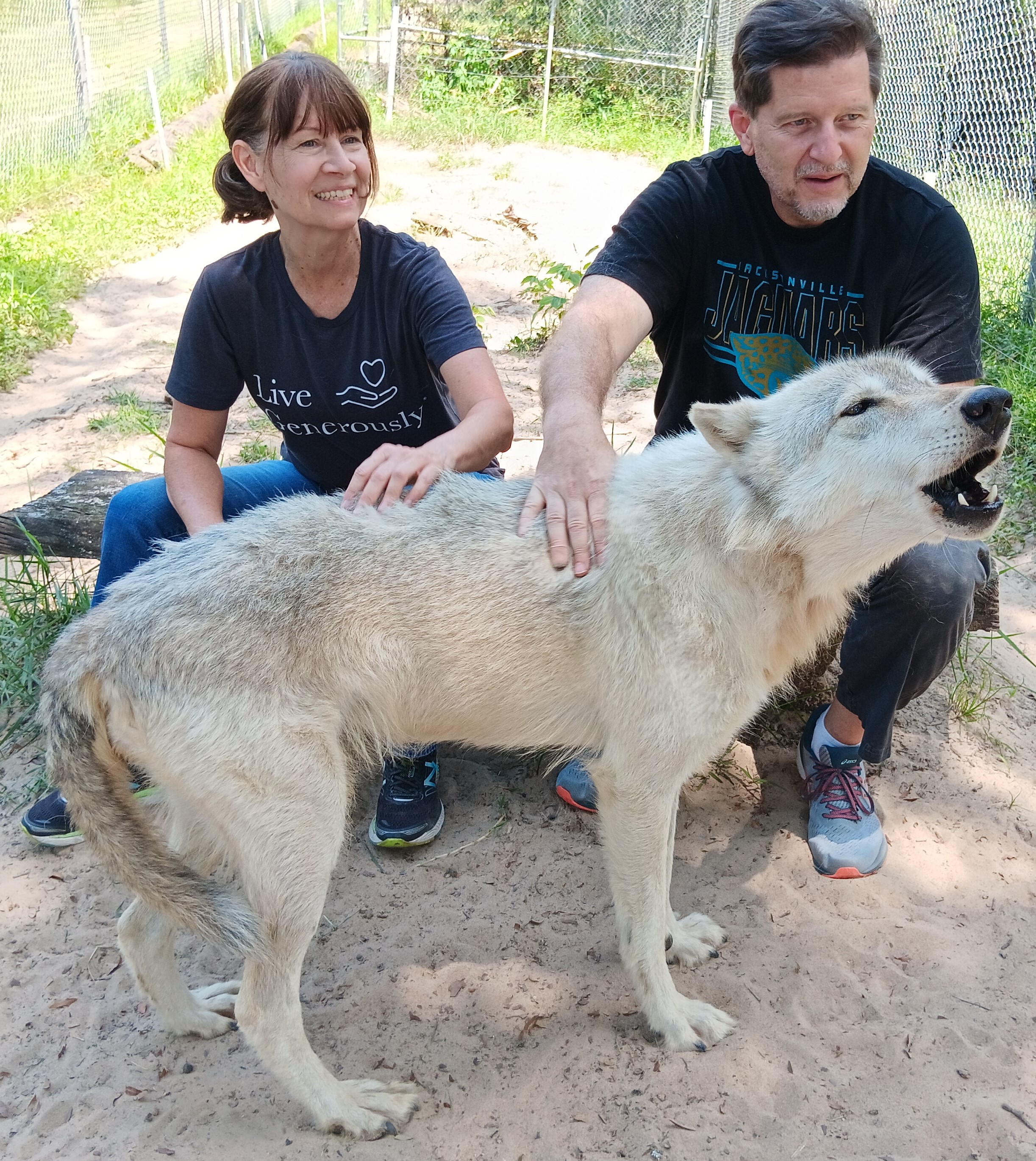 A vehicle finally pulled up to greet us. They opened the roped entry and led us down a dirt road to a small cabin. We met our tour guides and received instructions on what to do and not to do once we were with the wolves. My husband David then turned to me and said: “Look out the window.” Sitting looking toward us, as if waiting for us, was a very large wolf. Part of me was suddenly aware of the size and apparent strength of these magnificent animals and a bit of trepidation rose inside of me.
